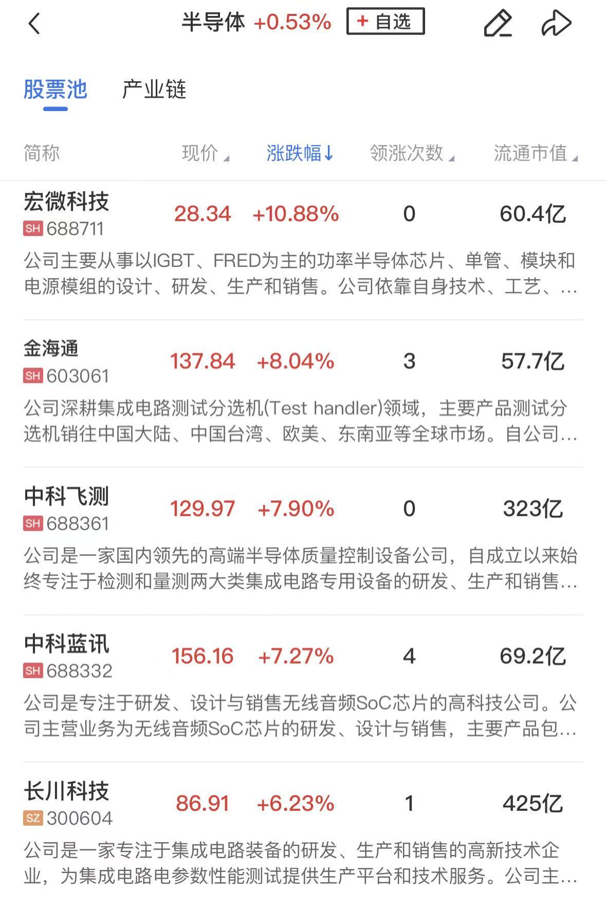 半导体同样展开反弹,宏微科技涨超10%,金海通、中科蓝讯、长川科技、拓荆科技、台基股份、华虹公司等跟涨。