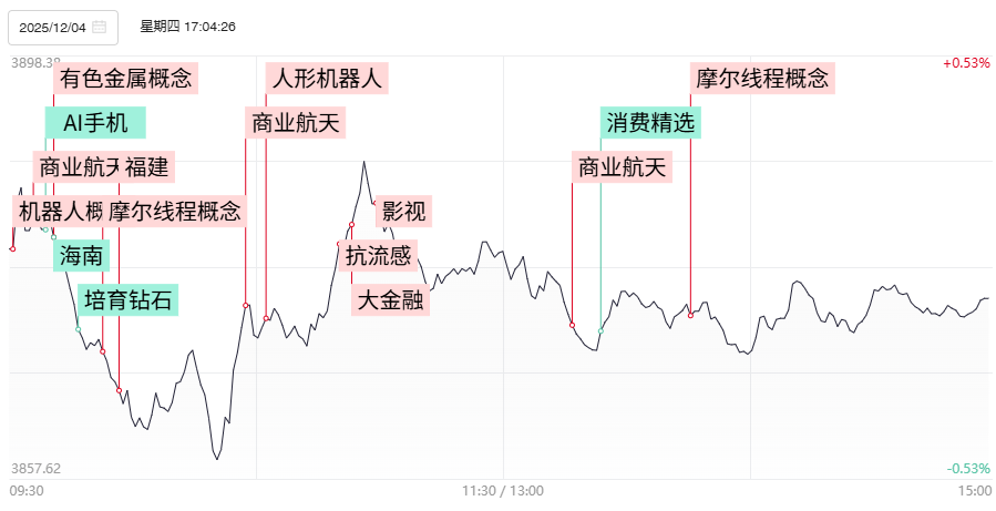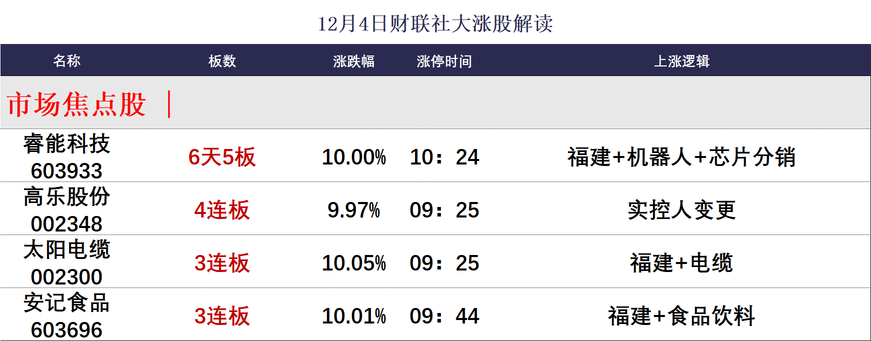 财联社12月4日讯,今日38股涨停,26股炸板,封板率为59%,高乐股份4连板,太阳电缆、安记食品3连板,睿能科技6天5板,新金路8天4板,航天机电5天3板。市场探底回升,创业板指涨超1%,早盘一度跌超0.5%。沪深两市成交额1.55万亿,较上一个交易日缩量1210亿。板块方面,机器人、商业航天等板块涨幅居前,海南、旅游、食品等板块跌幅居前。截至收盘,沪指跌0.06%,深成指涨0.4%,创业板指涨1.01%。