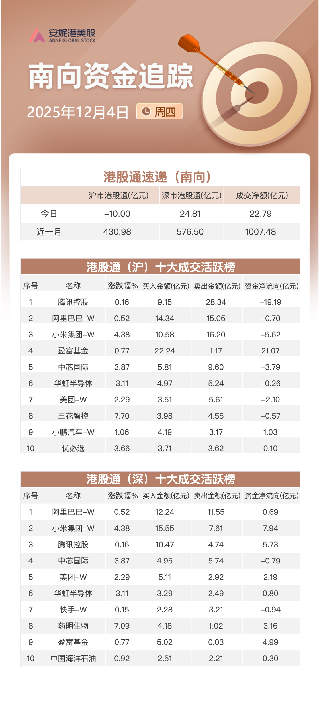 港股今日低开高走午后翻红,南向资金继续净买入约14.80亿港元。其中,沪港股通净流出约10亿港元,深港股通净流入约24.81亿港元。