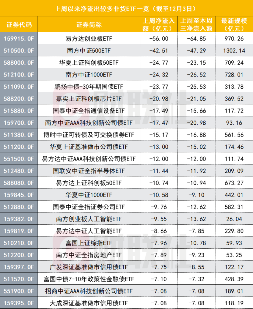 Wind数据显示,时隔4周,非货ETF上周再次出现净赎回,当周净赎回205.88亿份,合计净流出346.4亿元。