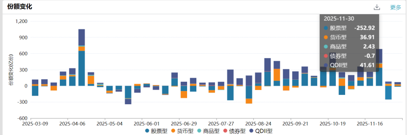 整体来看,资金在11月流入股票型ETF的力度环比减弱。数据显示,非货ETF在上个月的净流入1008.95亿元,此前10月、9月依次净流入1335.5亿元、2105.75亿元。