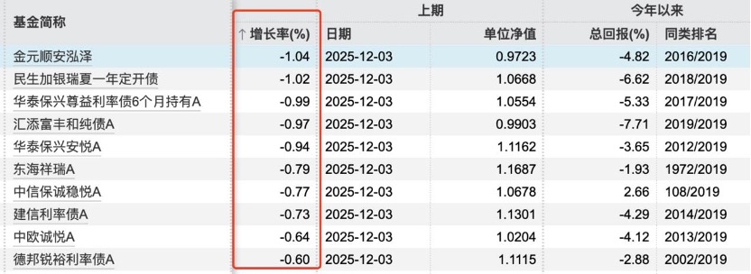 单只产品中,跌幅最多的是金元顺安泓泽,单日跌幅1.04%,跌超1%的还有民生加银瑞夏一年定开债,而华泰保兴尊益利率债6个月持有、汇添富丰和纯债、华泰保兴安悦等基金跌幅超0.9%。