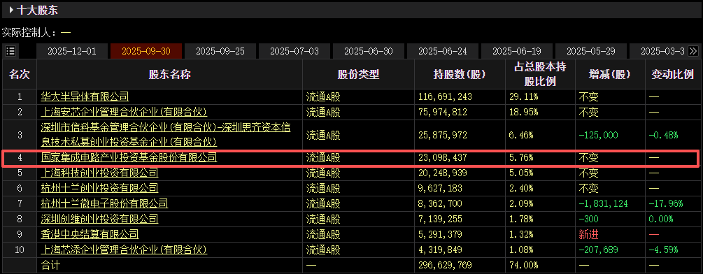 《科创板日报》5日讯,安路科技(688107.SH)公告称,国家集成电路产业投资基金股份有限公司于2025年10月15日~2025年10月16日通过集中竞价交易方式累计减持14.39万股,占公司总股本0.036%,本次减持计划时间区间已届满。原计划减持不超过400.85万股,占公司总股本1.00%,未完成386.46万股。减持完成后,大基金持股比例降至5.73%。