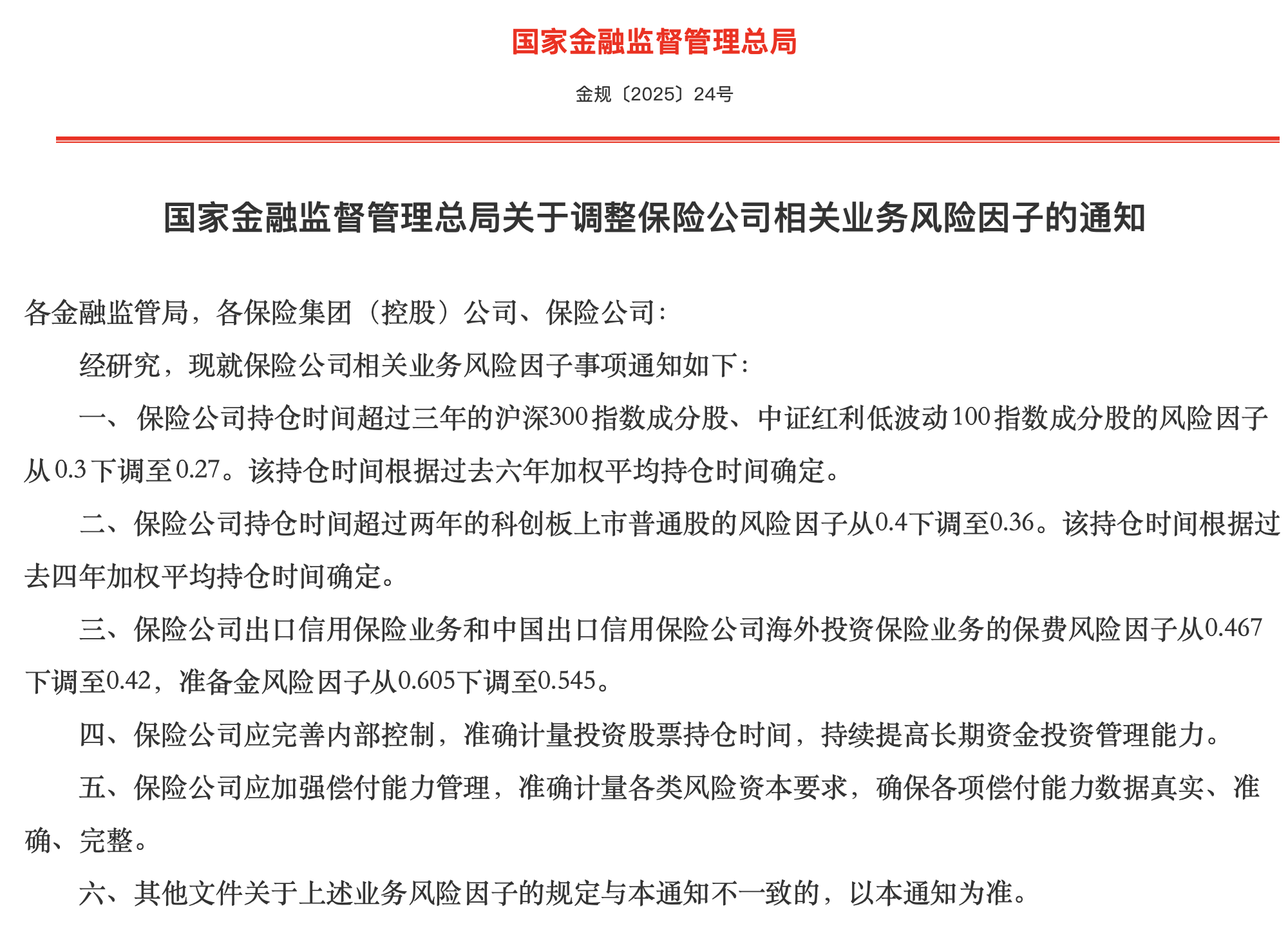 ①《通知》中提到,保险公司持仓时间超过两年的科创板上市普通股的风险因子从0.4下调至0.36。该持仓时间根据过去四年加权平均持仓时间确定。 ②特别是科创板相关风险因子下调,会提升险资对科创公司投资意愿,推动更多资金流入战略性新兴产业,助力科技创新企业发展。