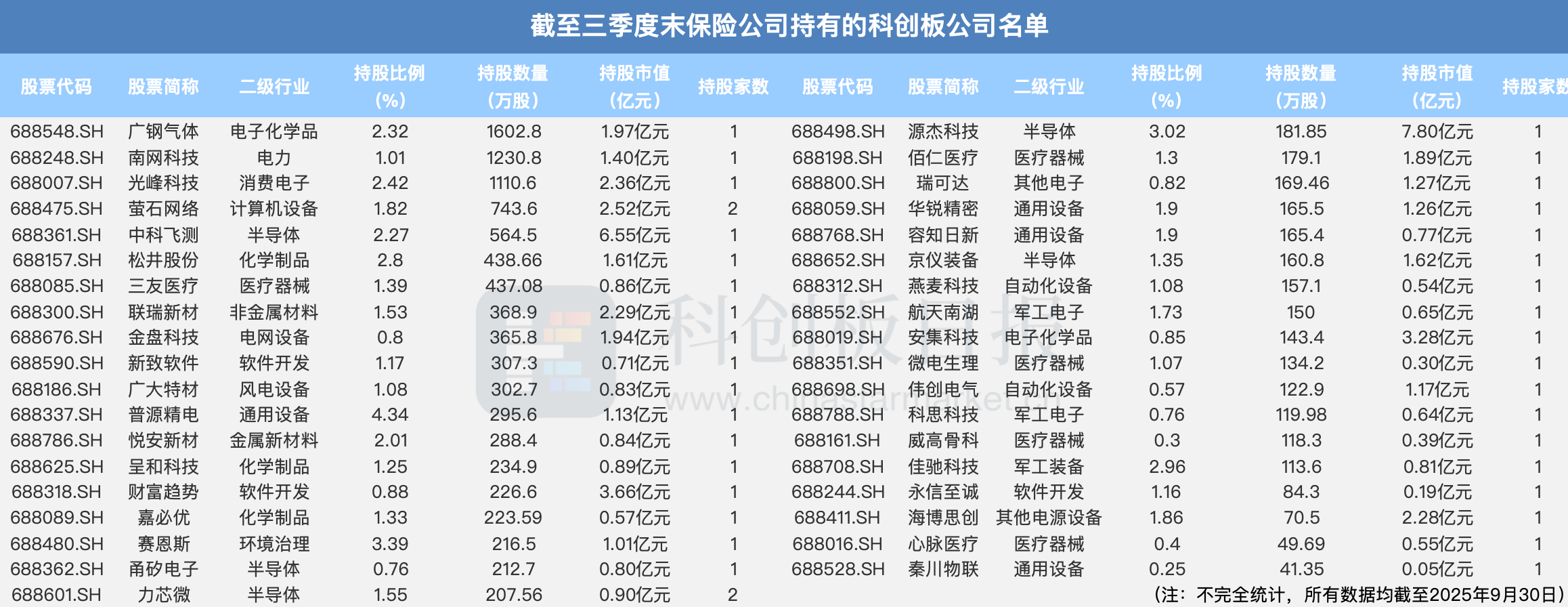 据财联社星矿数据不完全统计,截至2025年三季度末,保险公司共持有38家科创板公司,以持有股份数量排序,排名前三的为广钢气体、南网科技、光峰科技,保险公司持有这三家公司的股份数量均超千万股。