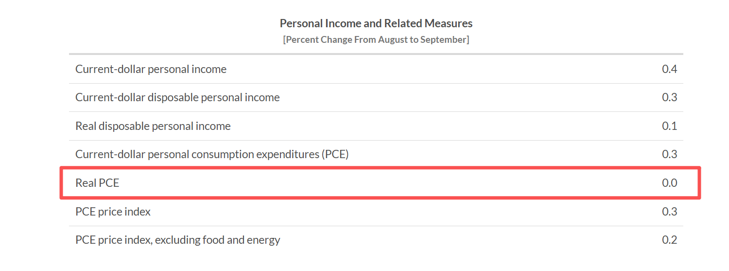 9月PCE报告也显示,美国消费者的实际可支配收入连续第二个月几乎没有增长。工资和薪金(未经过通胀调整的指标)上涨0.4%,而资产收入(富裕家庭的重要支撑)有所回升。