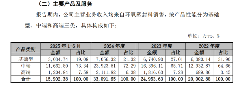 中科科化是一家专注于半导体封装材料研发、生产和销售的国家级专精特新“小巨人”企业,主要产品为环氧塑封料。业绩数据显示,2022-2024年,公司主营业务收入从20,002.88万元持续增长至33,091.65万元,2025年上半年实现营收15,902.38万元。