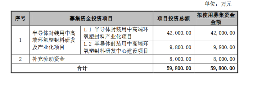 中科科化本次发行募集资金5.98亿元,扣除发行费用后的净额将用于与公司主营业务相关的投资项目:半导体封装用中高端环氧塑封料研发及产业化项目、补充流动资金。