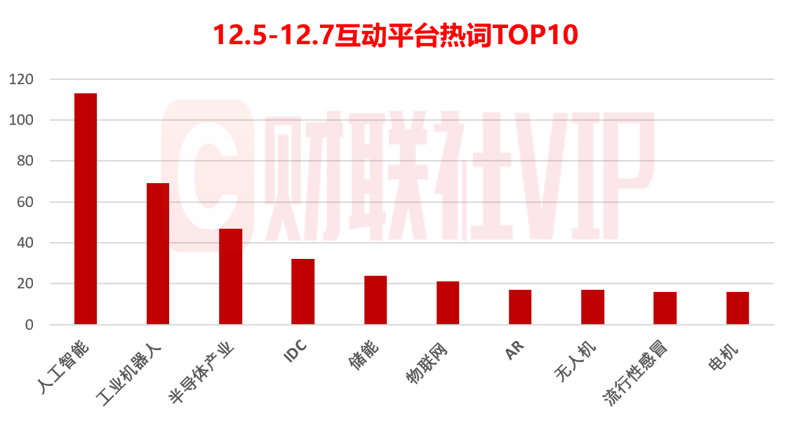 从图表热词统计数据看,人工智能、工业机器人、半导体产业排名前三,此外还有IDC、储能、物联网等靠前。