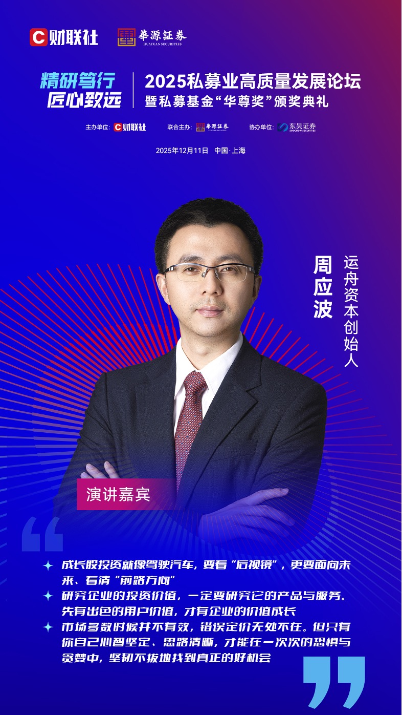 第二位主讲嘉宾是上海运舟私募基金董事长周应波。作为国内少有的兼具公募辉煌履历与私募成功创业经验的代表,周应波自2022年创立运舟资本以来,始终坚守“基于基本面研究的长期持有”策略,在近年复杂市场环境中展现出显著的韧性与超额收益能力。
