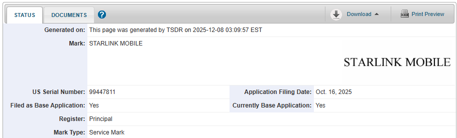 根据美国专利商标局(USPTO)网站的信息,SpaceX早于10月16日就提交了这项服务商标的申请。目前,该申请已被商标局受理,正等待分配给审查律师。
