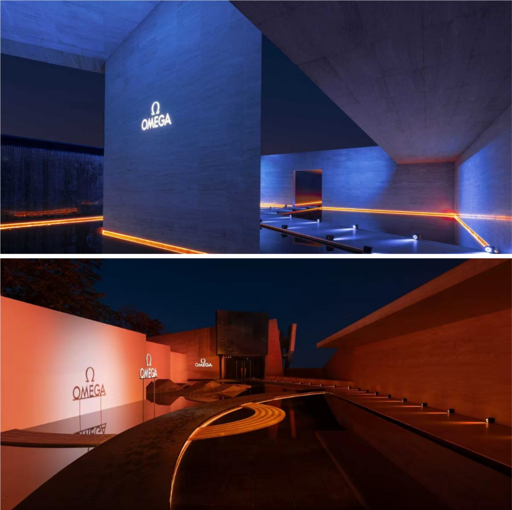 金色的阳光洒落在水景之上,给庆典现场披上了欧米茄标志性的橙色。当夜幕降临,迷人的橙蓝灯光在现场交织,投射出灵动的海洋意境,不仅与全新海洋宇宙腕表的配色相得益彰,也彰显出欧米茄历史悠久且经典传奇的海洋探索历程。在极具张力的橙蓝光影中,第四代海洋宇宙全新表款陈列在场地中央,嘉宾们可近距离欣赏全新腕表的美学设计与精妙细节,沉浸式体验欧米茄在潜水表领域的制表实力和创新精神。