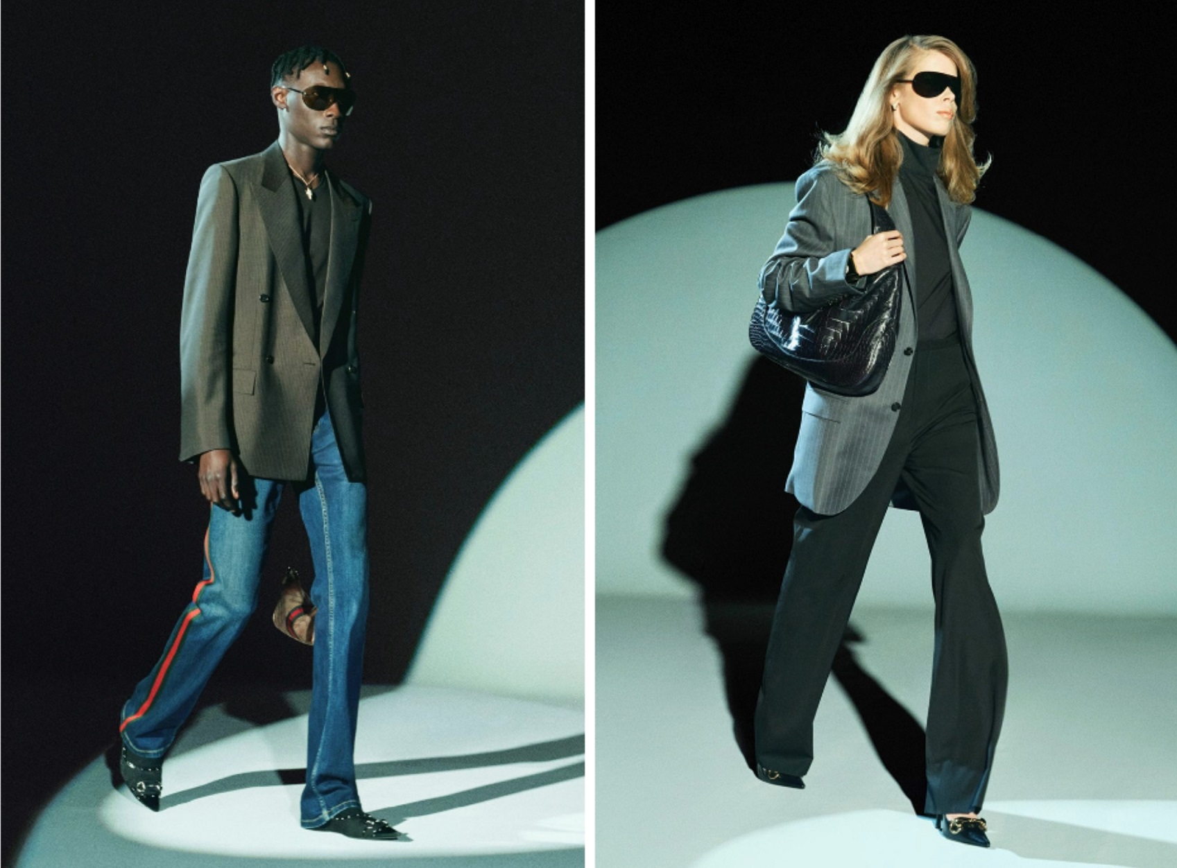 造型型录以轻盈精裁西装开场,选用典藏真丝罗缎面料,通过织造工艺还原做旧手感。摒弃纽扣设计的女士套装以极简扣件固定:两件套西装搭配紧身裤装,以及标志性的古驰铅笔裙。