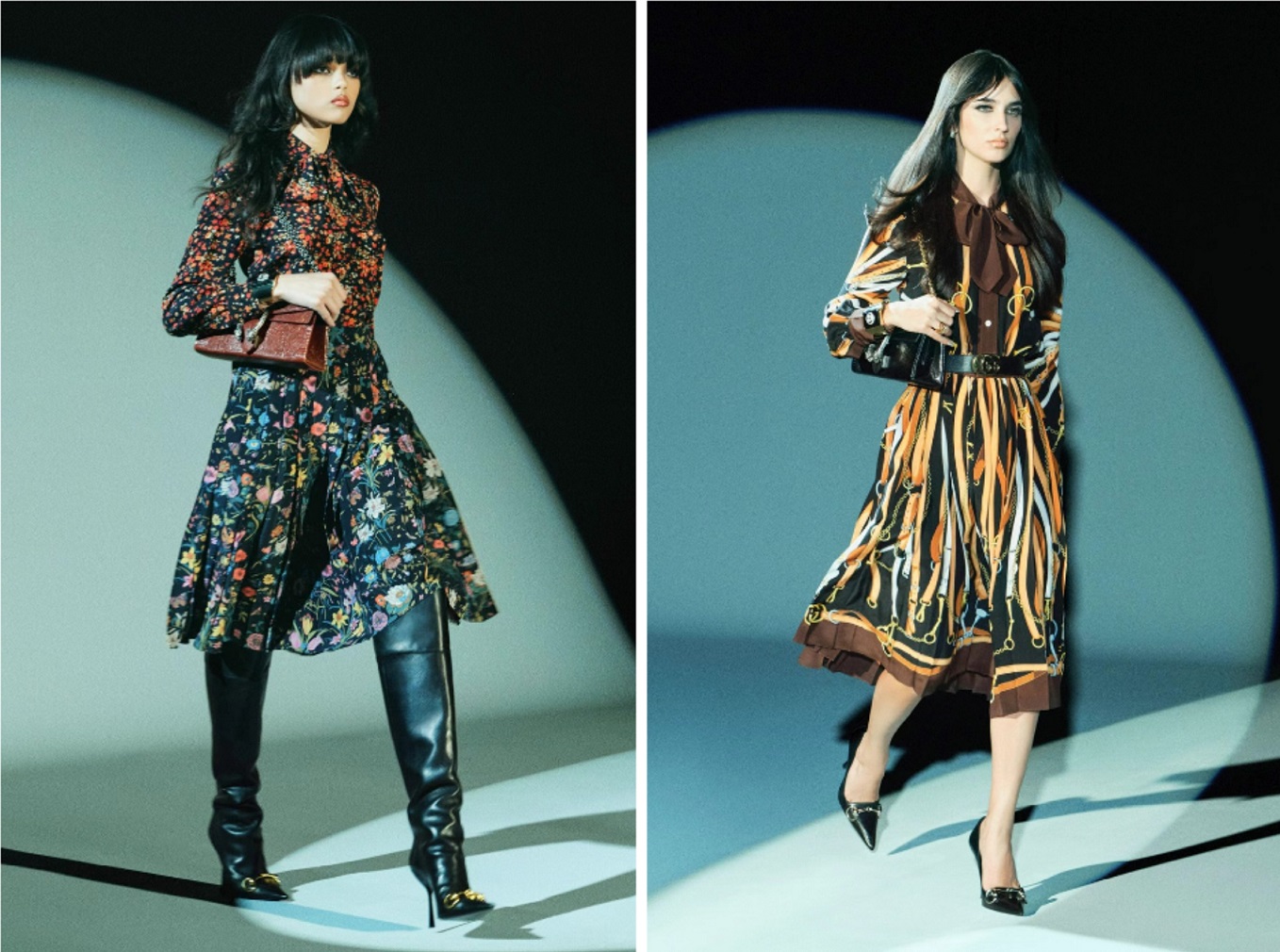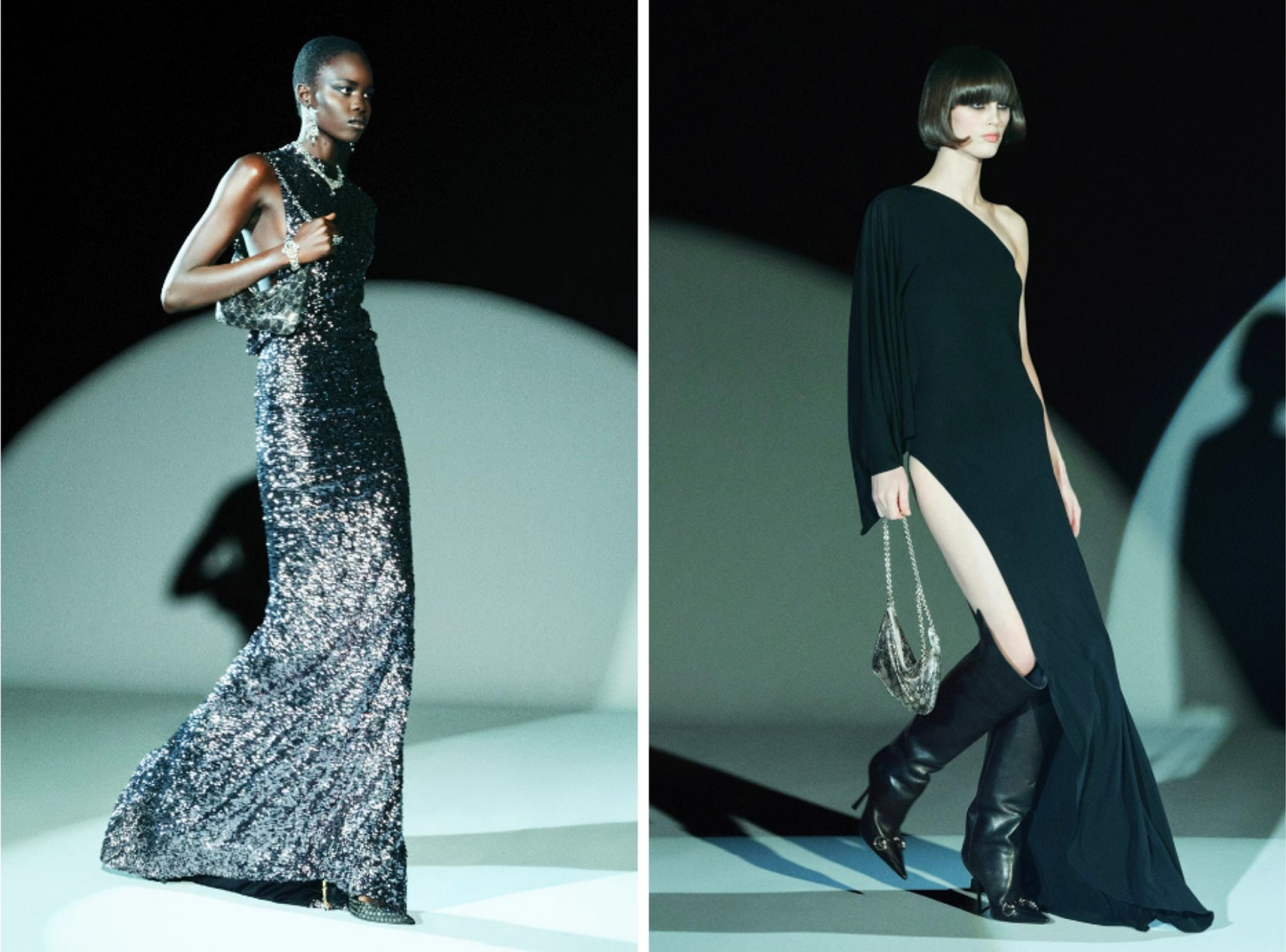 派对主题衣橱以内衣风格单品为核心,搭配丝绸短夹克、与上衣呼应的垂坠迷你裙,以及由顺滑织物与真丝雪纺绸裁制而成的极简礼服。重新诠释上世纪70与90年代的标志性古驰元素,赛车夹克饰有Web织带条纹,腰带首度展示切割样式的经典双G搭扣。另有从头到脚的皮革与绒面皮革时装造型,以及从典藏丝巾中汲取灵感的马术主题印花丝绸套装。