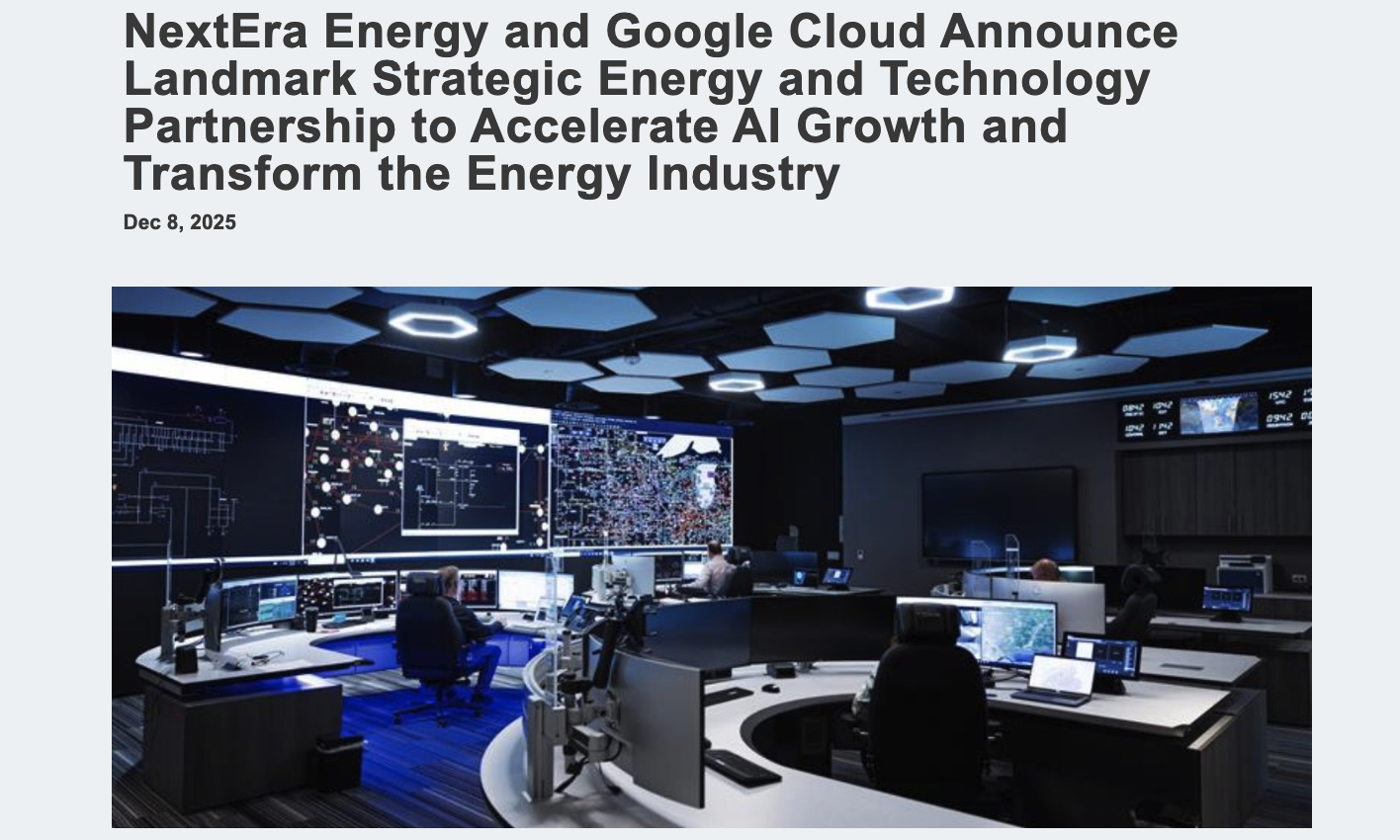 电力巨头也将通过部署谷歌的AI模型推动智慧电网转型。新纪元能源与谷歌云计划在2026年中期推出一款由人工智能驱动的产品,用于预测设备故障、优化人员调度,并在风暴、设备老化和需求上升的情况下提升电网可靠性。