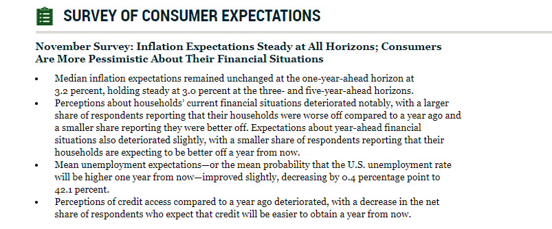 纽约联储的调查显示,11月的通胀预期方面整体温和: 一年期通胀预期维持在3.2%;三年期和五年期预期均维持在3%不变。