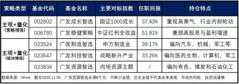 广发资源智选(023834)、广发科技智选(023647)、广发制造智选(023524)均为2025年内新发的主题增强型产品,均采用“主观多头+主动量化+AI增强”的复合策略。