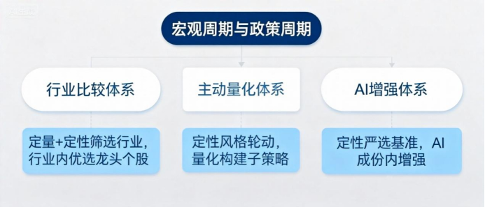 根据投资方法和策略目标,杨冬团队管理的产品线可划分为底仓型、Smart Beta风格增强型及主题增强型三个类别。以杨冬对宏观周期的系统研判为核心,通过分析经济、盈利、货币、政策四大周期动态,指导大类资产配置与行业布局。