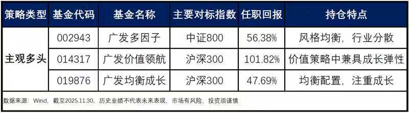 除了广发多因子,团队旗下的底仓型产品还有广发价值领航一年(014317)与广发均衡成长(019876),这两只产品自成立以来的累计收益分别达到101.82%和47.69%,年化收益率均达到20%以上(数据来源:Wind,截至2025.11.30)。