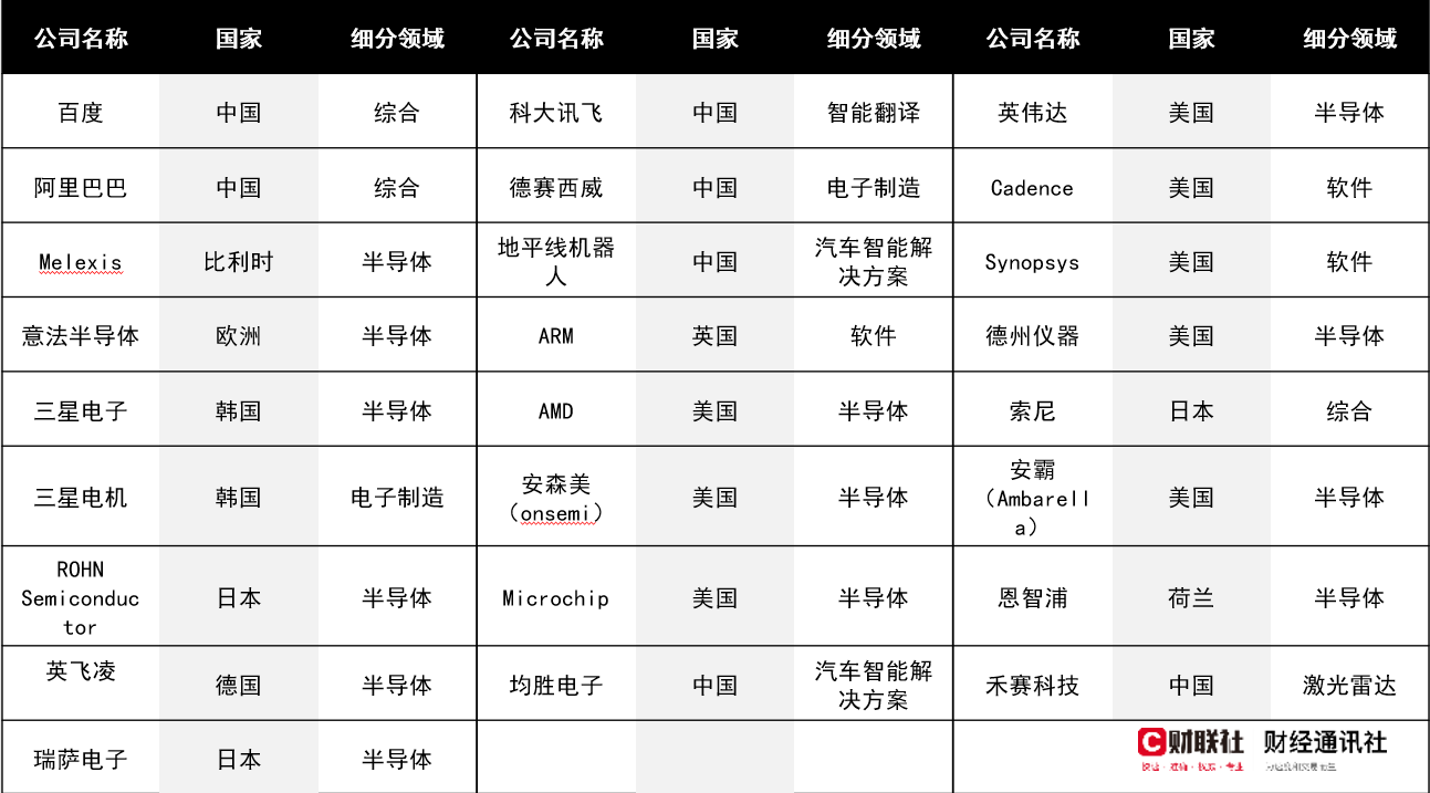 大摩在本月稍早的一份报告中还列出了25家有望在未来主导该行业的公司,分析师称这份名单重点关注在人工智能和计算芯片、摄像头和感知、传感器及运动技术方面有专业知识的公司。