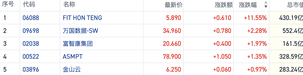 截至发稿,今日FIT HON TENG(06088.HK)即鸿腾精密大涨超11%,万国数据-SW(09698.HK)涨逾2%,富智康集团(02038.HK)等相关个股也纷纷跟涨。