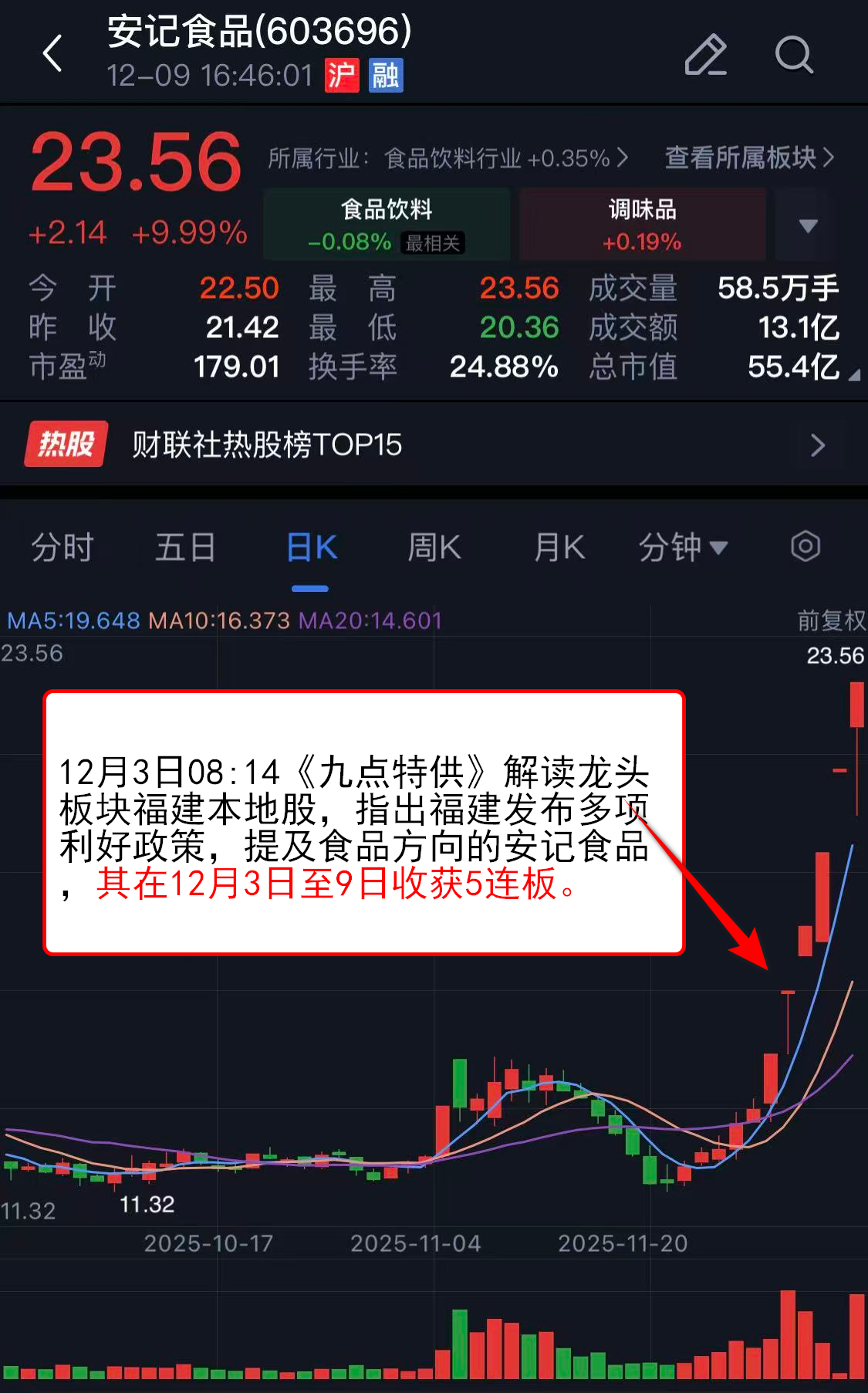 12月3日08:14《九点特供》解读龙头板块福建本地股,指出福建发布多项利好政策,提及食品方向的安记食品,其在12月3日至9日收获5连板。