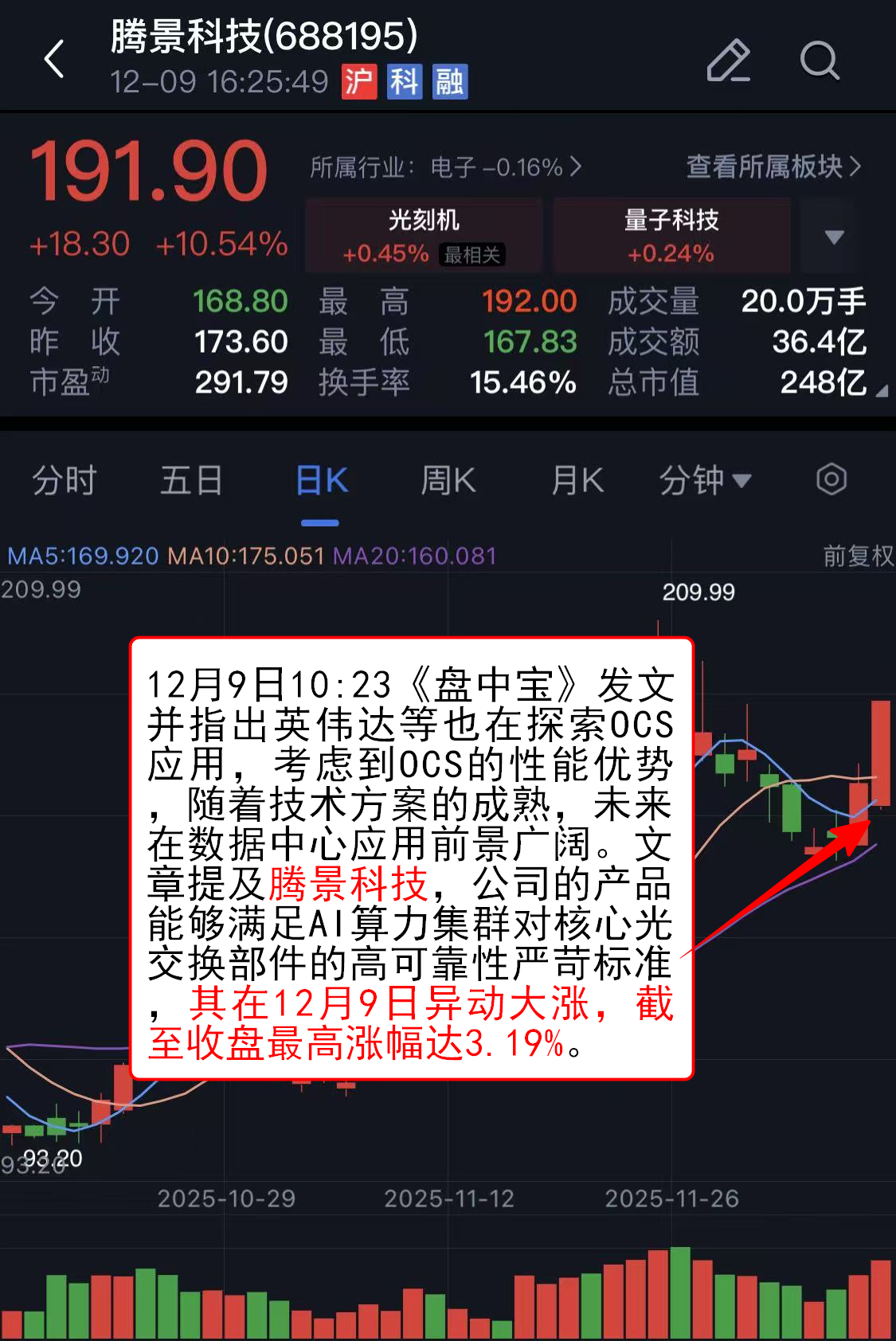 12月9日10:23《盘中宝》发文并指出英伟达等也在探索OCS应用,考虑到OCS的性能优势,随着技术方案的成熟,未来在数据中心应用前景广阔。文章提及腾景科技,公司的产品能够满足AI算力集群对核心光交换部件的高可靠性严苛标准,其在12月9日异动大涨,截至收盘最高涨幅达3.19%。