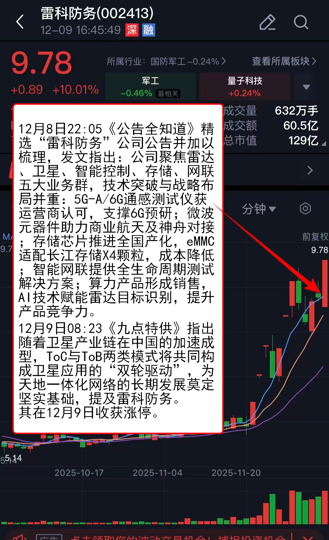 12月8日22:05《公告全知道》精选“雷科防务”公司公告并加以梳理,发文指出:公司聚焦雷达、卫星、智能控制、存储、网联五大业务群,技术突破与战略布局并重:5G-A/6G通感测试仪获运营商认可,支撑6G预研;微波元器件助力商业航天及神舟对接;存储芯片推进全国产化,eMMC适配长江存储X4颗粒,成本降低;智能网联提供全生命周期测试解决方案;算力产品形成销售,AI技术赋能雷达目标识别,提升产品竞争力。