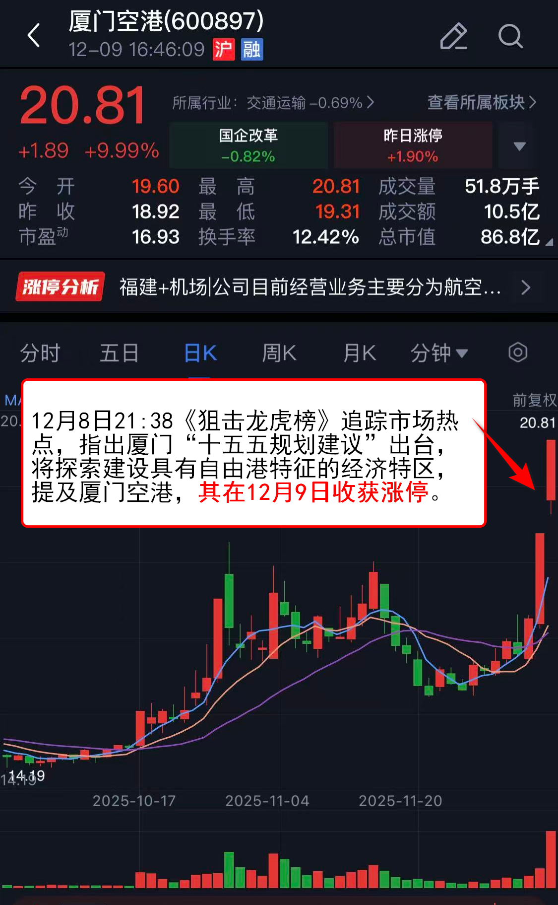 12月8日21:38《狙击龙虎榜》追踪市场热点,指出厦门“十五五规划建议”出台,将探索建设具有自由港特征的经济特区,提及厦门空港,其在12月9日收获涨停。