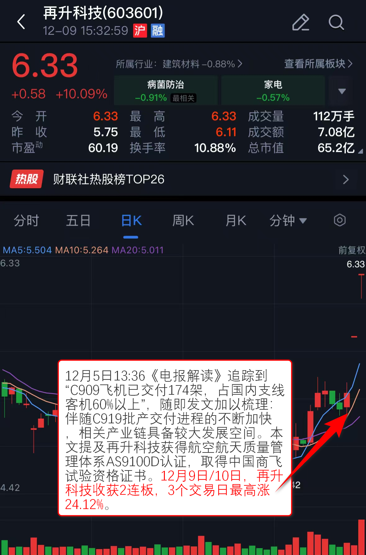 12月5日13:36《电报解读》追踪到“C909飞机已交付174架,占国内支线客机60%以上”,随即发文加以梳理:伴随C919批产交付进程的不断加快,相关产业链具备较大发展空间。本文提及再升科技获得航空航天质量管理体系AS9100D认证,取得中国商飞试验资格证书。12月9日/10日,再升科技收获2连板,3个交易日最高涨24.12%。