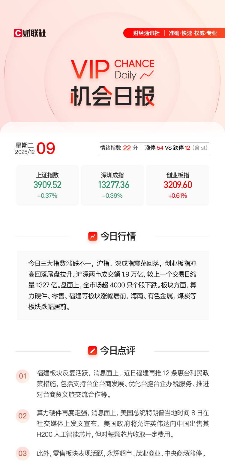 消息面上,美国总统特朗普当地时间8日在社交媒体上发文宣布,美国政府将允许英伟达向中国出售其H200人工智能芯片,但对每颗芯片收取一定费用。