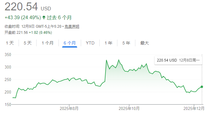 然而,投资者们的欢庆宴会时间并没有持续太久:甲骨文股价仅仅在历史高位持续了半个月左右,就迎来了震荡下跌。从9月末至今,甲骨文股价已经从345.22美元的历史高位跌至220.54美元,两个多月内累计跌幅达到36%。