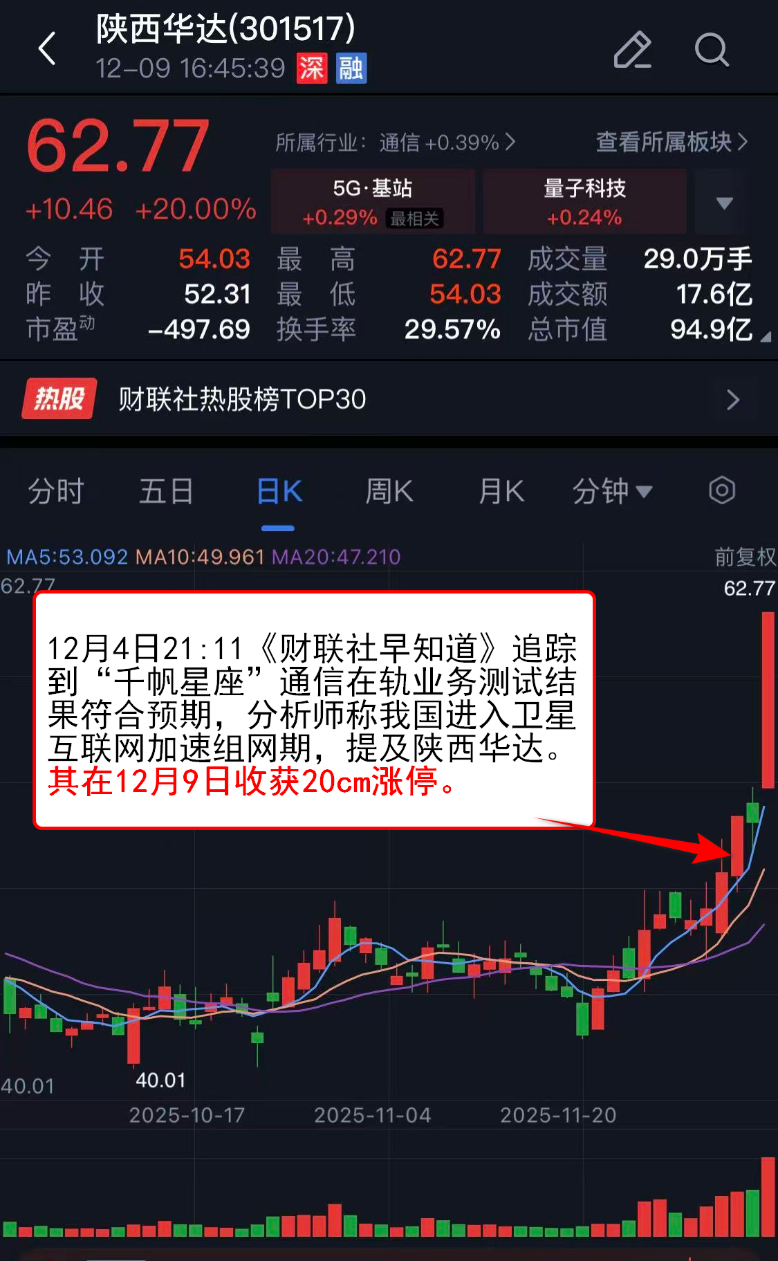 12月4日21:11《财联社早知道》追踪到“千帆星座”通信在轨业务测试结果符合预期,分析师称我国进入卫星互联网加速组网期,提及陕西华达。其在12月9日收获20cm涨停。