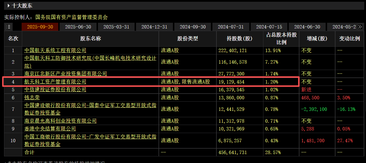 小财注:截至三季度末,航天科工资产公司位列航天发展第四大股东,持有1912.95万股,持股比例1.2%。二级市场方面,航天发展股价自9月低点迄今累计最大涨幅212%。
