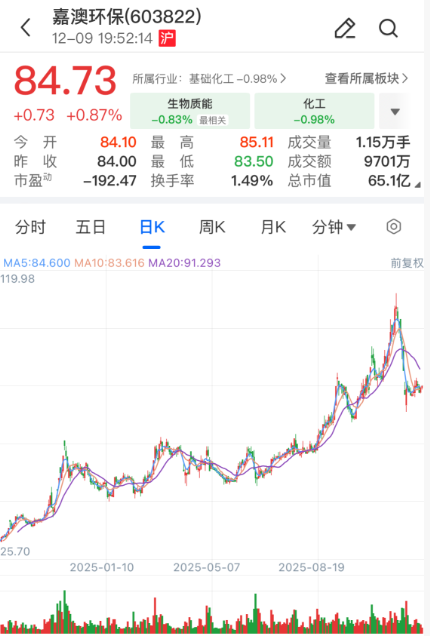 截至今日收盘,嘉澳环保单日涨0.87%,报84.73元/股;今年迄今,该股涨幅达到73.77%。值得一提的是,该股在11月13日一度摸高至119.98元,创下历史新高,随后股价震荡下挫。