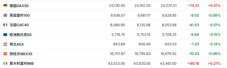 正在交易的欧洲股市涨跌不一,德国DAX指数现涨0.31%,英国富时100指数跌0.09%,法国CAC40指数跌0.51%。