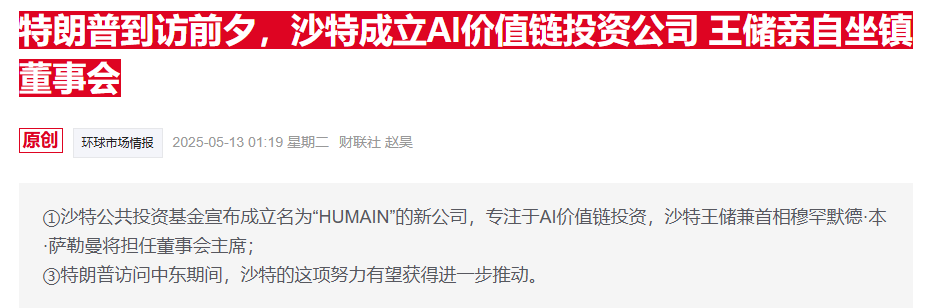 卡塔尔的行动与沙特七个月前的做法相似。今年5月时,沙特主权财富基金公共投资基金(PIF)成立HUMAIN。该公司由PIF全资拥有,负责在AI价值链上开展运营和投资。