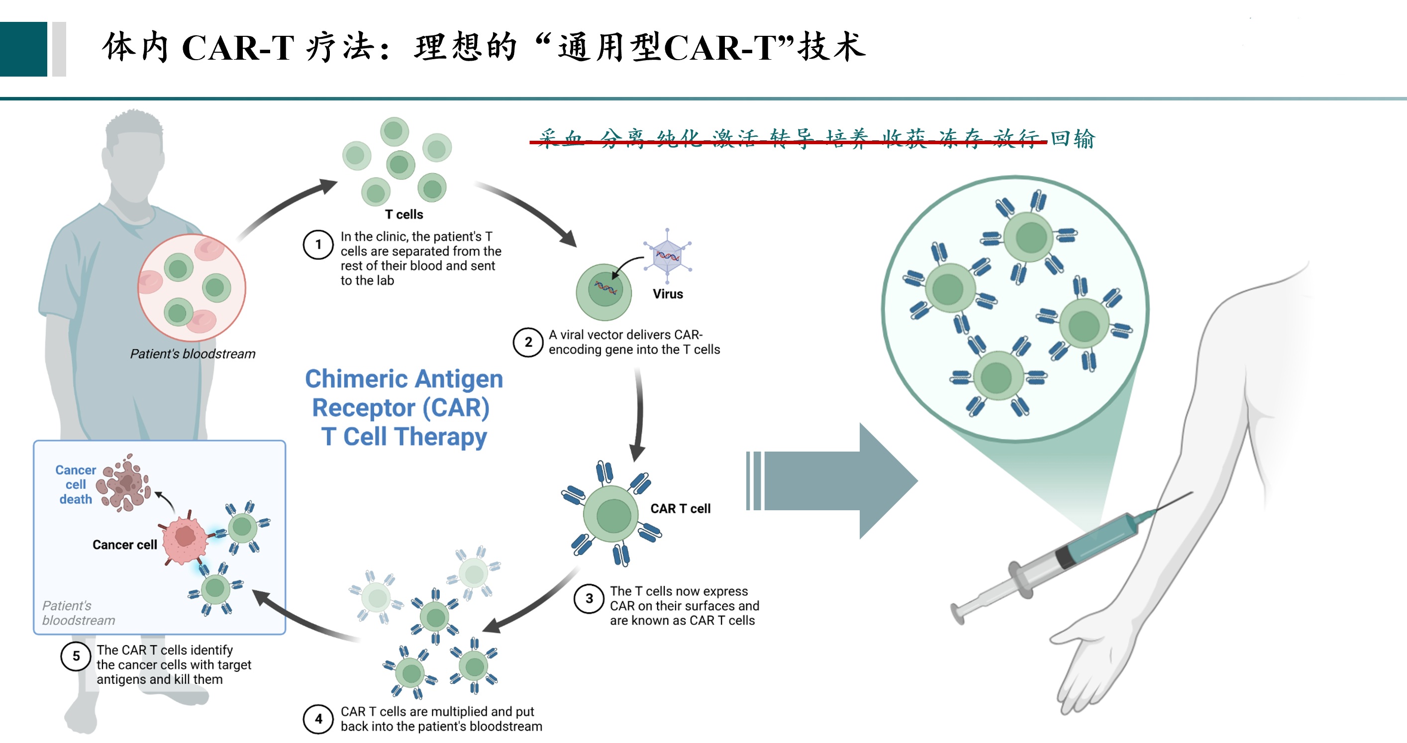 体内CAR-T的“一站式”流程不仅省去了传统CAR-T繁琐且耗时的体外扩增与回输环节,患者也无需提前住院做进行传统疗法中回输前的淋巴清除预处理。