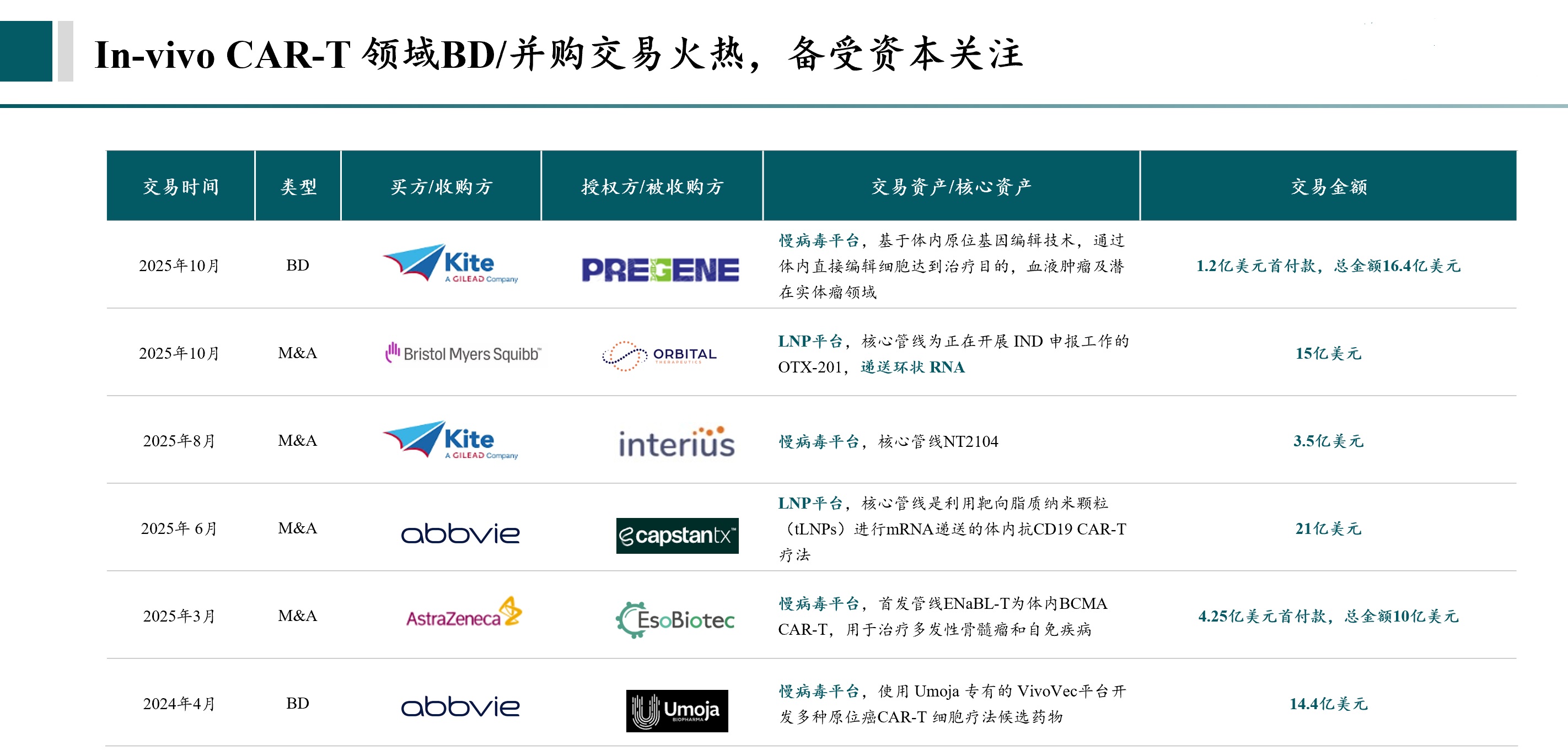 自2025以来,已有包括阿斯利康、艾伯维、吉利德等跨国药企巨头通过授权引进或并购方式强势切入该赛道。就在今年10月,百时美施贵宝以15亿美元现金收购了体内CAR-T公司Orbital,强化了其在细胞治疗领域的产品布局。