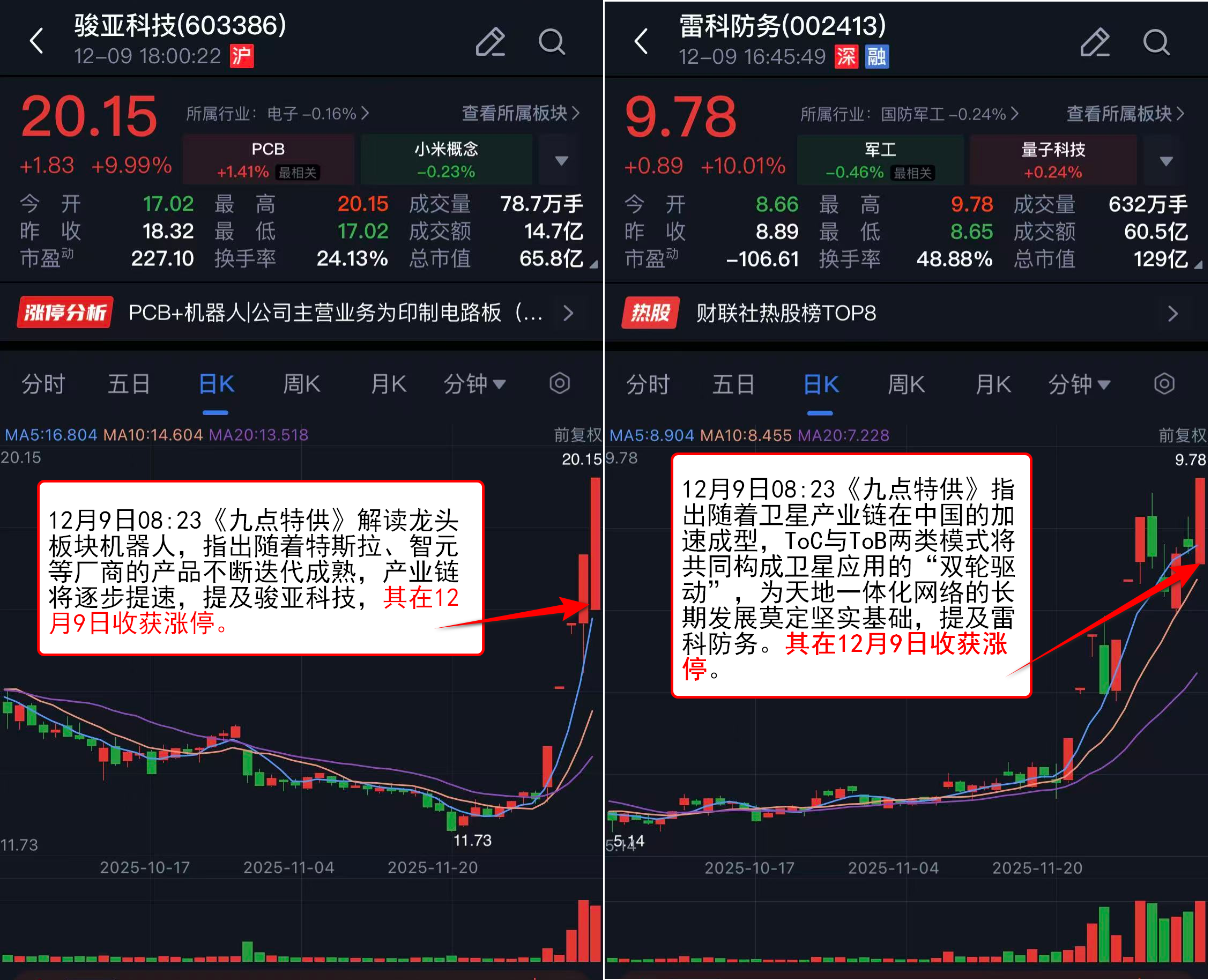 往期回顾:12月9日08:23《九点特供》指出随着卫星产业链在中国的加速成型,ToC与ToB两类模式将共同构成卫星应用的“双轮驱动”,为天地一体化网络的长期发展莫定坚实基础,提及雷科防务。其在12月9日收获涨停。同篇,栏目解读龙头板块机器人,指出随着特斯拉、智元等厂商的产品不断迭代成熟,产业链将逐步提速,提及骏亚科技,其在12月9日收获涨停。