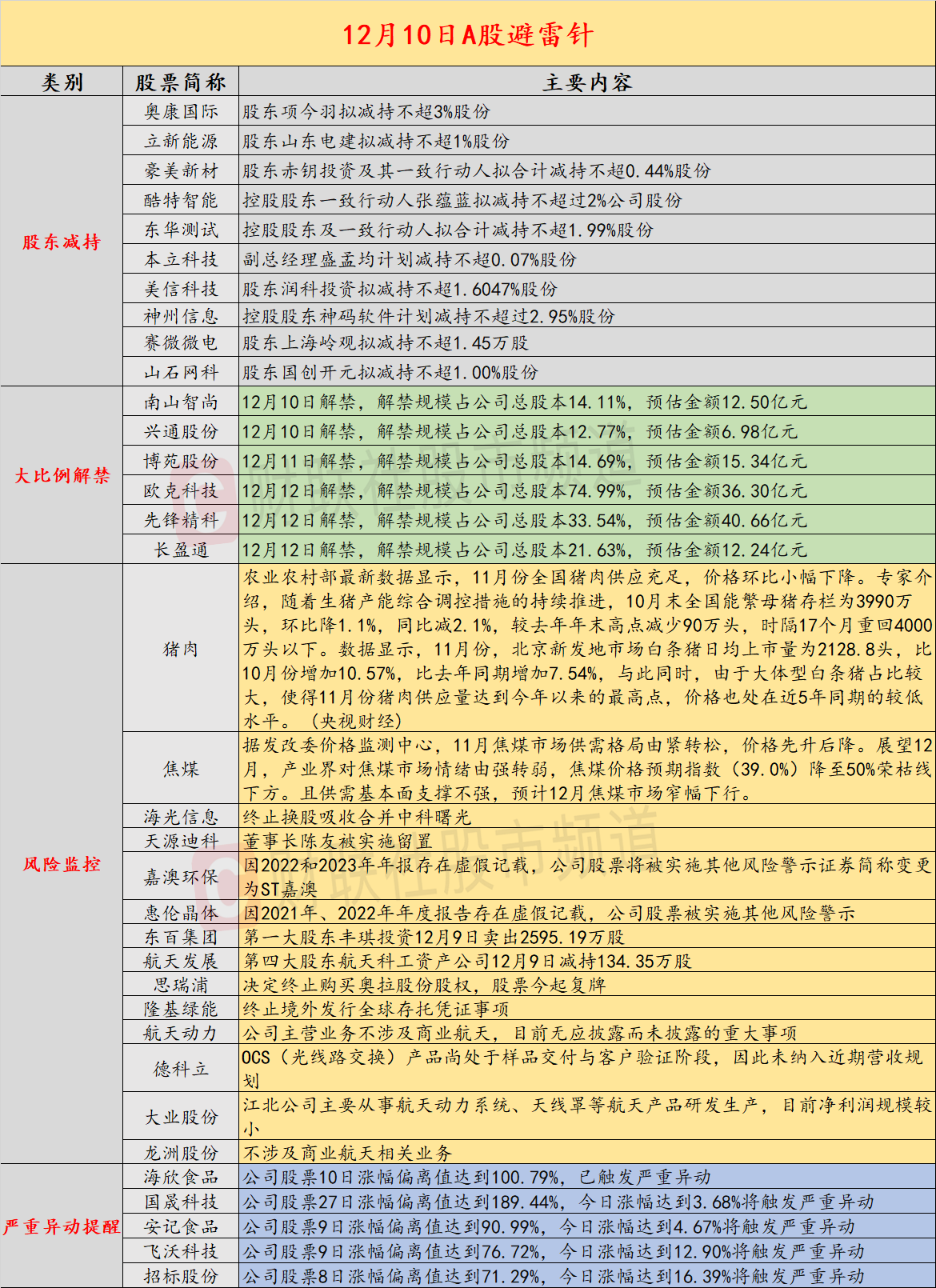 导读:财联社12月10日投资避雷针,近日,A股及海外市场潜在风险事件如下。国内经济信息方面包括:1)国内商品期市夜盘收盘多数下跌,化工品跌幅居前;2)11月猪肉供应量达到年内高点,猪价处于近5年同期低点;公司方面重点关注包括:1)海光信息终止换股吸收合并中科曙光;2)嘉澳环保因2022和2023年年报存在虚假记载,公司股票将被实施其他风险警示证券简称变更为ST嘉澳;海外市场重点关注包括:1)美股三大指数收盘涨跌不一,摩根大通跌超4%;2)美修订版《生物安全法案》将被纳入讨论,未点名具体企业。