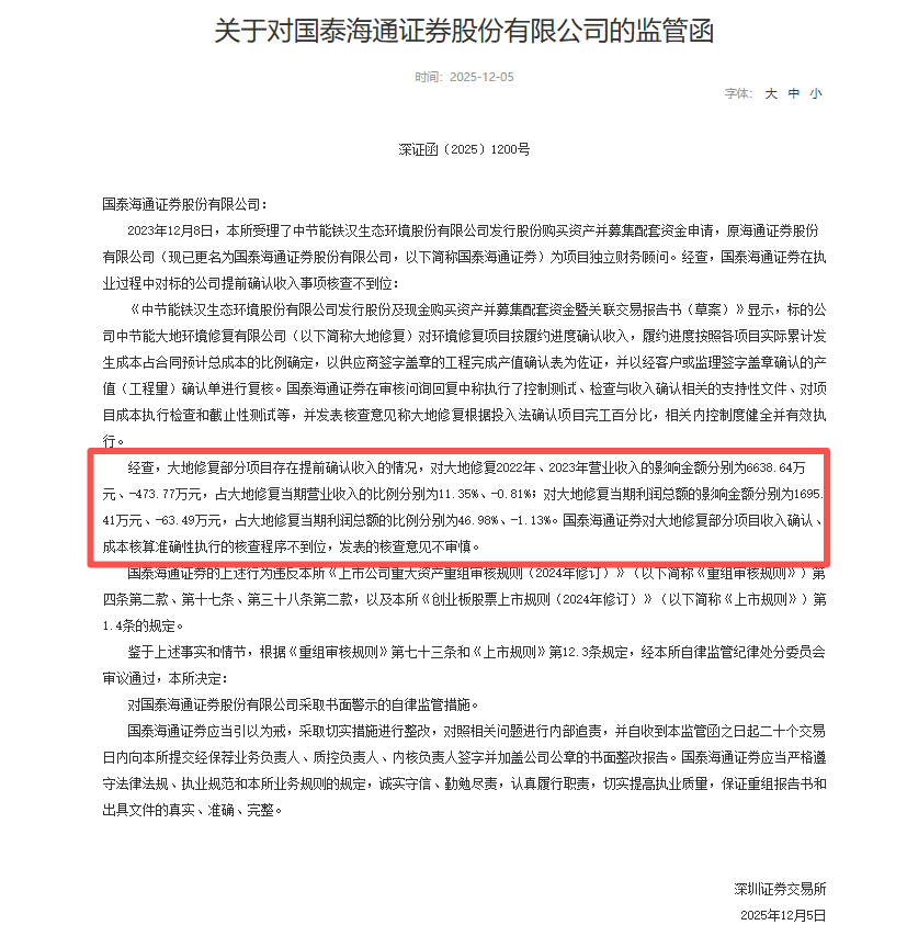深交所认定,国泰海通对大地修复部分项目收入确认、成本核算准确性执行的核查程序不到位,发表的核查意见不审慎。