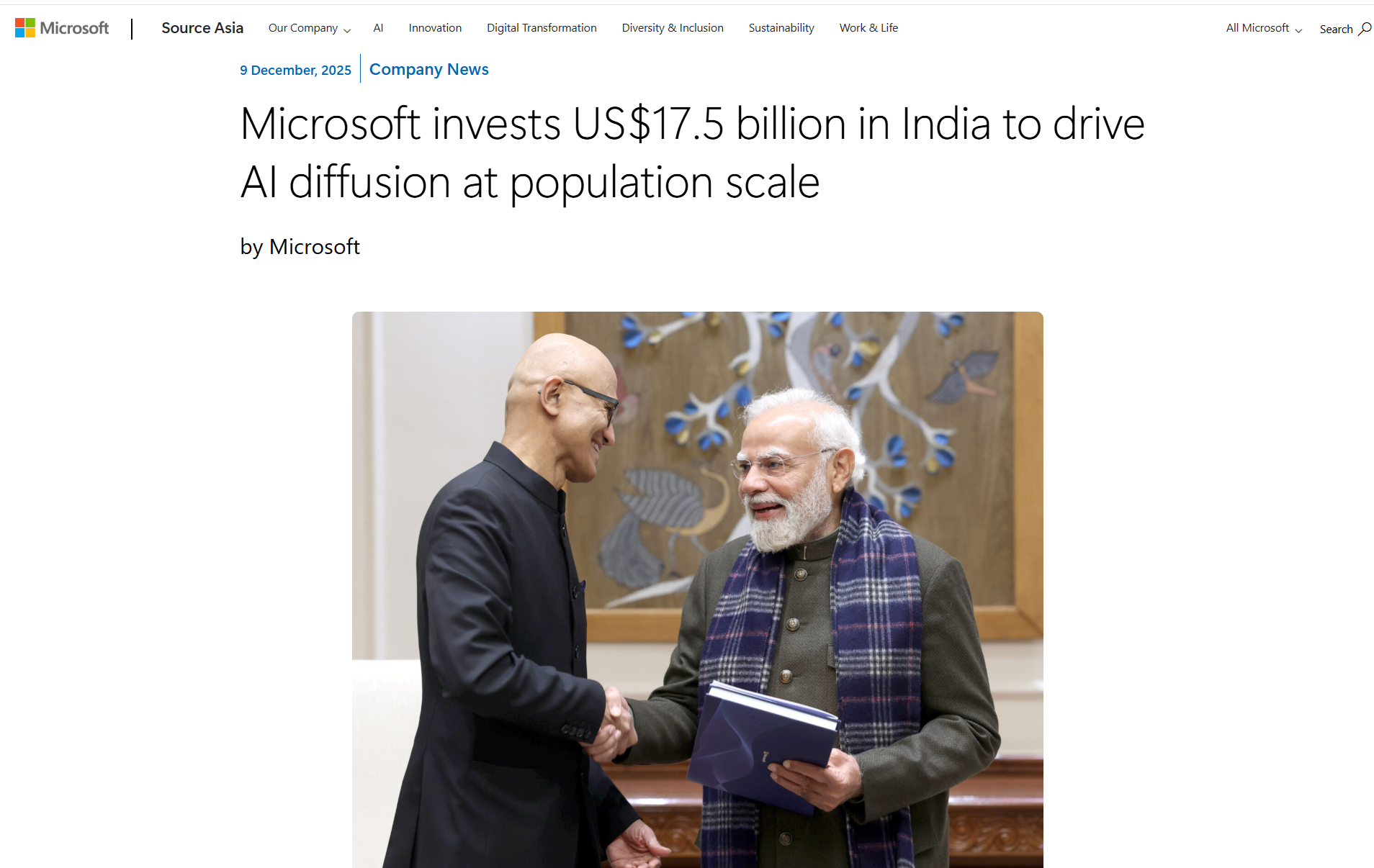微软史上最大亚洲投资计划:在印豪掷175亿美元 兴建AI数据中心
