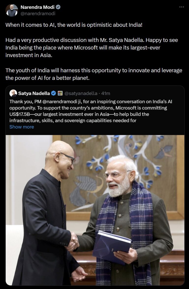 在新德里与印度总理莫迪会面后,纳德拉在一篇 X 帖子中透露了在印度投资的计划。