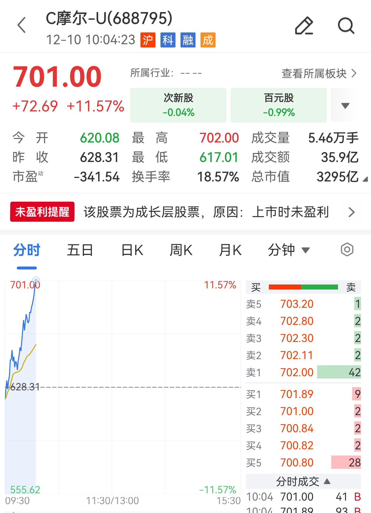 财联社12月10日讯,今日早盘,摩尔线程拉升涨超10%,股价成功突破上市首日688元高点,总市值突破3200亿元。