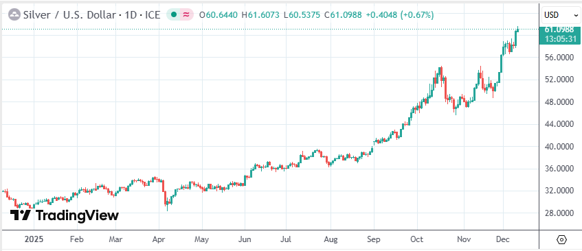 具体行情显示,现货银价于周三欧洲时段一度达到每盎司61.62美元,日内涨幅最大时超过1.3%。本月银价已经累涨近9%,有望连涨第八个月,年初至今涨幅超112%。