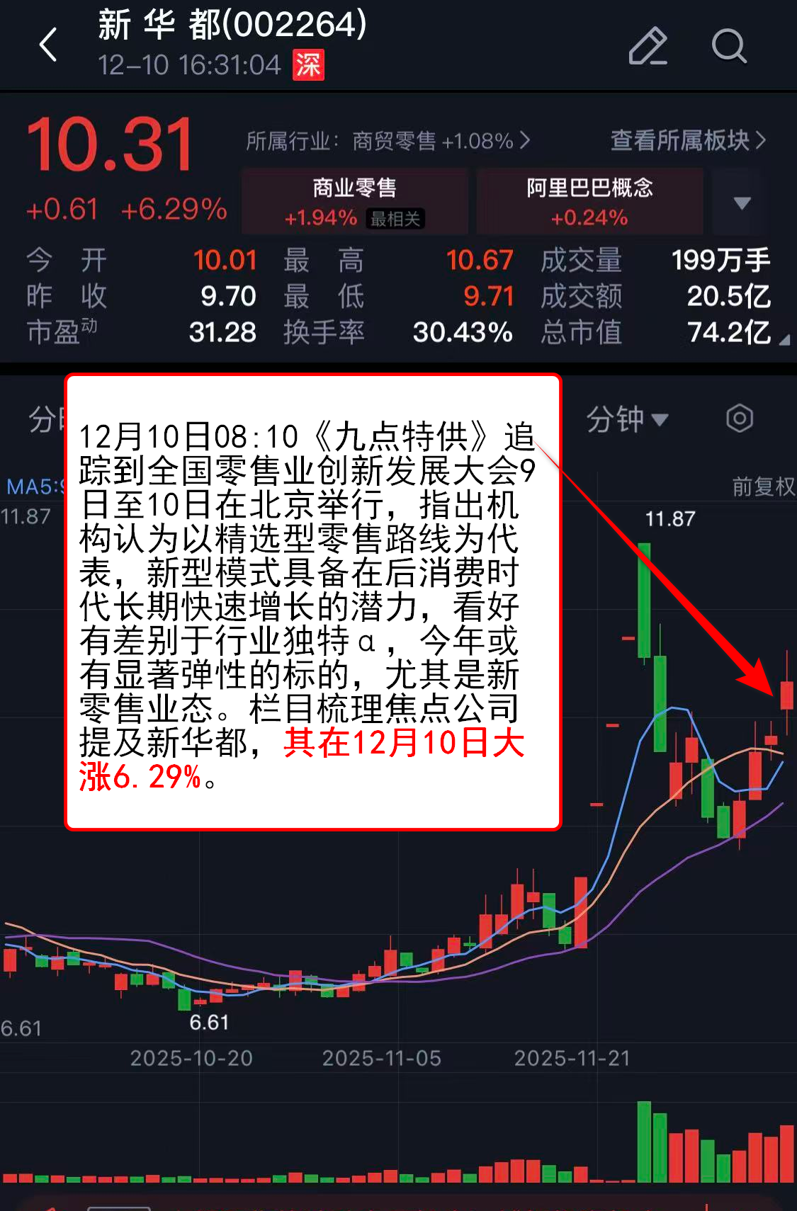 12月10日08:10《九点特供》追踪到全国零售业创新发展大会9日至10日在北京举行,指出机构认为以精选型零售路线为代表,新型模式具备在后消费时代长期快速增长的潜力,看好有差别于行业独特α,今年或有显著弹性的标的,尤其是新零售业态。栏目梳理焦点公司提及新华都,其在12月10日大涨6.29%。