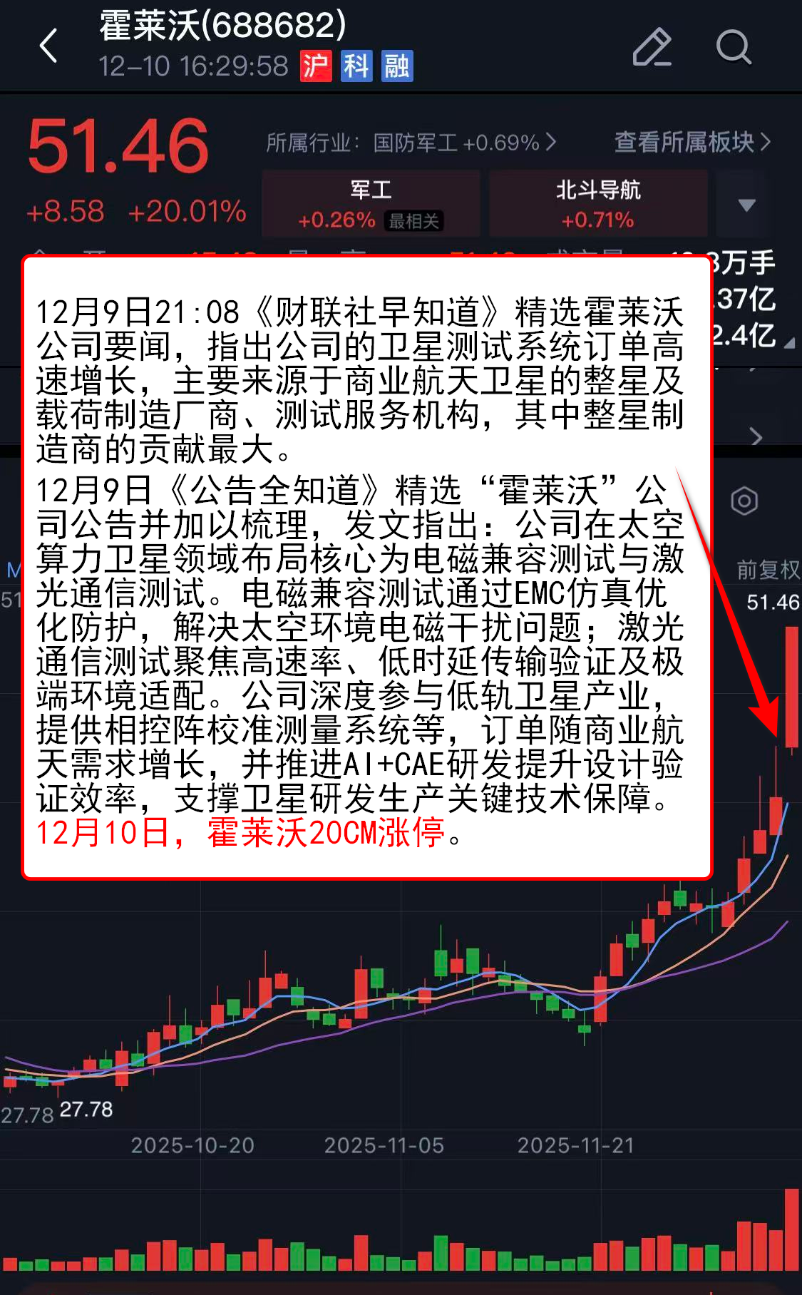 12月9日21:08《财联社早知道》精选霍莱沃公司要闻,指出公司的卫星测试系统订单高速增长,主要来源于商业航天卫星的整星及载荷制造厂商、测试服务机构,其中整星制造商的贡献最大。
