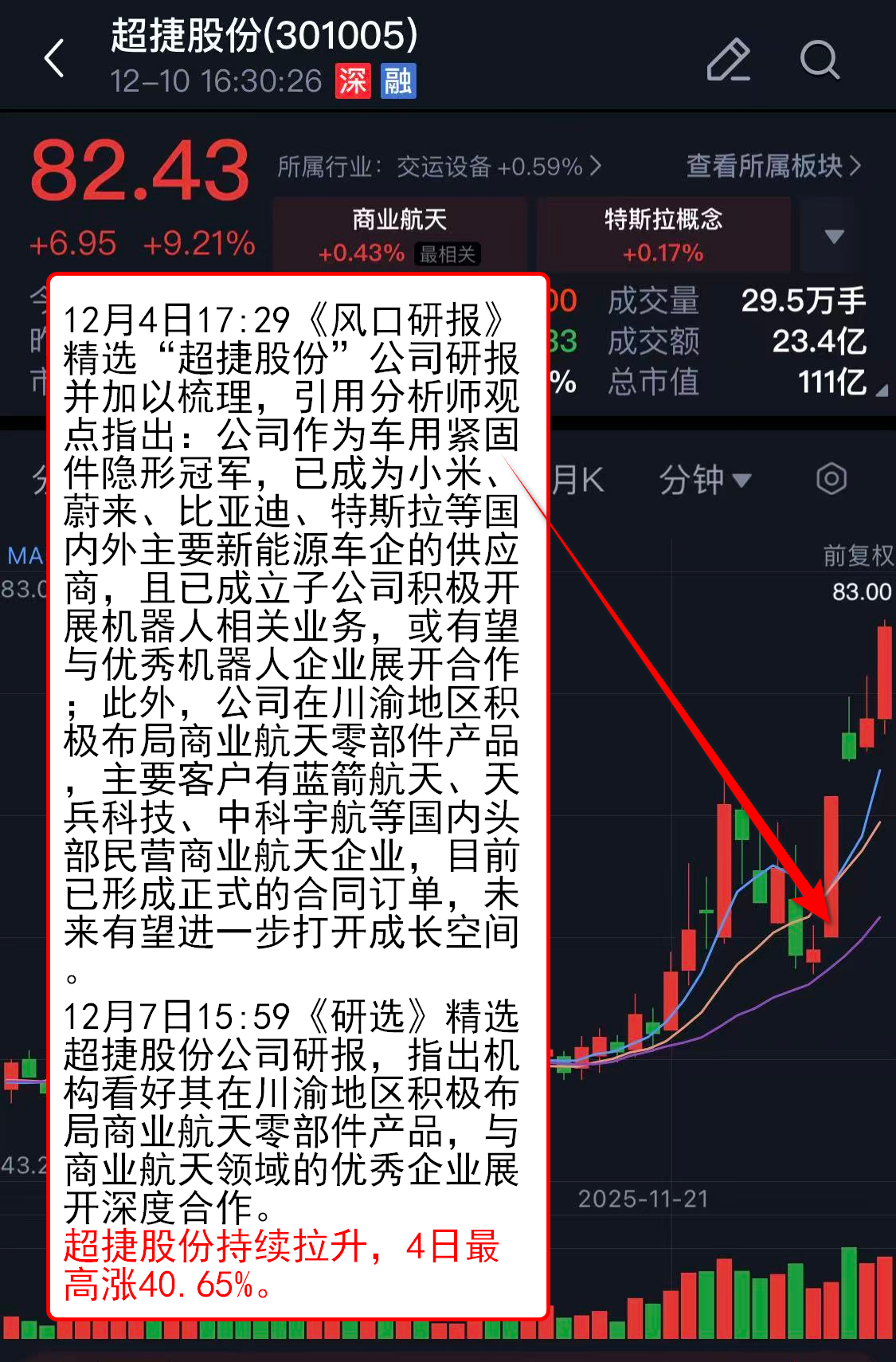 12月4日17:29《风口研报》精选“超捷股份”公司研报并加以梳理,引用分析师观点指出:公司作为车用紧固件隐形冠军,已成为小米、蔚来、比亚迪、特斯拉等国内外主要新能源车企的供应商,且已成立子公司积极开展机器人相关业务,或有望与优秀机器人企业展开合作;此外,公司在川渝地区积极布局商业航天零部件产品,主要客户有蓝箭航天、天兵科技、中科宇航等国内头部民营商业航天企业,目前已形成正式的合同订单,未来有望进一步打开成长空间。