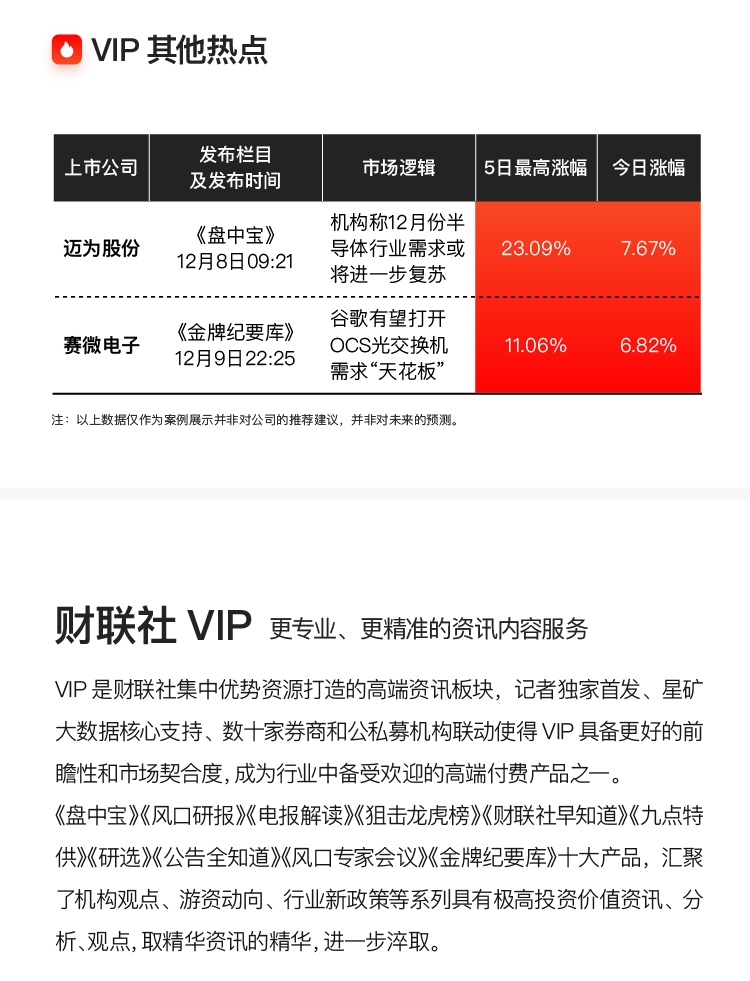 注:财联社VIP为内容资讯产品,并非投资建议。以下内容仅为资讯价值展示非对相关公司的推荐建议,非未来走势预测。投资有风险,入市需谨慎。